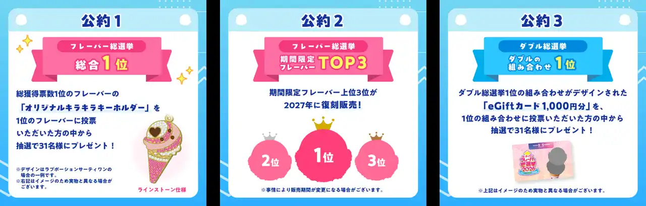 「総合1位」「期間限定フレーバーTOP3」「ダブルの組み合わせ1位」に輝いたフレーバーに対して、プレゼントや復刻販売など、うれしい企画をご用意しています。 |