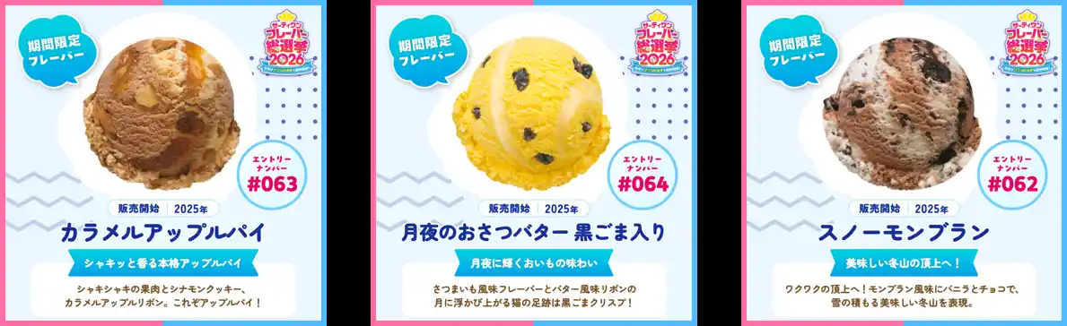 また、前回はエントリーしていなかった、近年の新作フレーバー「カラメルアップルパイ」や「月夜のおさつバター 黒ごま入り」、フレーバーコンテストの優勝フレーバー「スノーモンブラン」など、新しいフレーバーたちにも注目です。 |