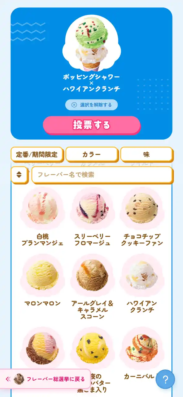 あの頃食べていた思い出のフレーバーや、まだ食べたことはないけれど食べてみたい魅力的なフレーバーたちが全82種類エントリー。今年はダブル総選挙も同時開催なので、昔食べた懐かしの組み合わせや、お気に入りと期間限定の組み合わせなど、自由に組み合わせて投票することができます。 |
