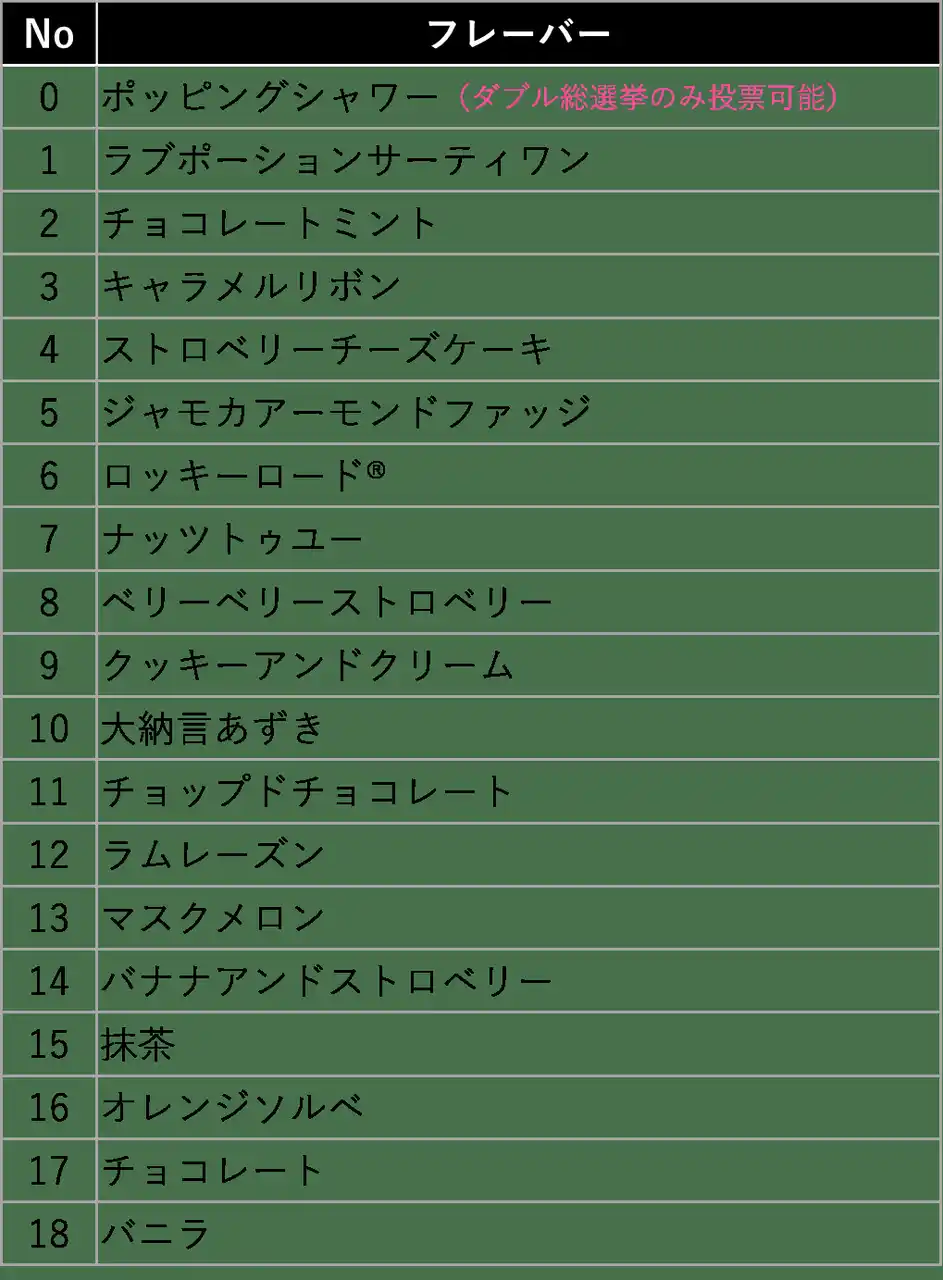 前回の総選挙で上位入賞した「マジカルミントナイト」「ダイキュリーアイス」、最近販売して大人気だった「ハワイアンクランチ」「チョコレートムースロイヤル」など、ファンの多いフレーバーたちが一体何位にランクインするのか目が離せません。 |