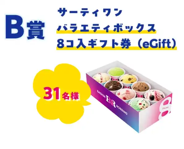 B賞:サーティワンバラエティボックスレギュラー8 コ入ギフト券(eGift)を31名様にプレゼント |