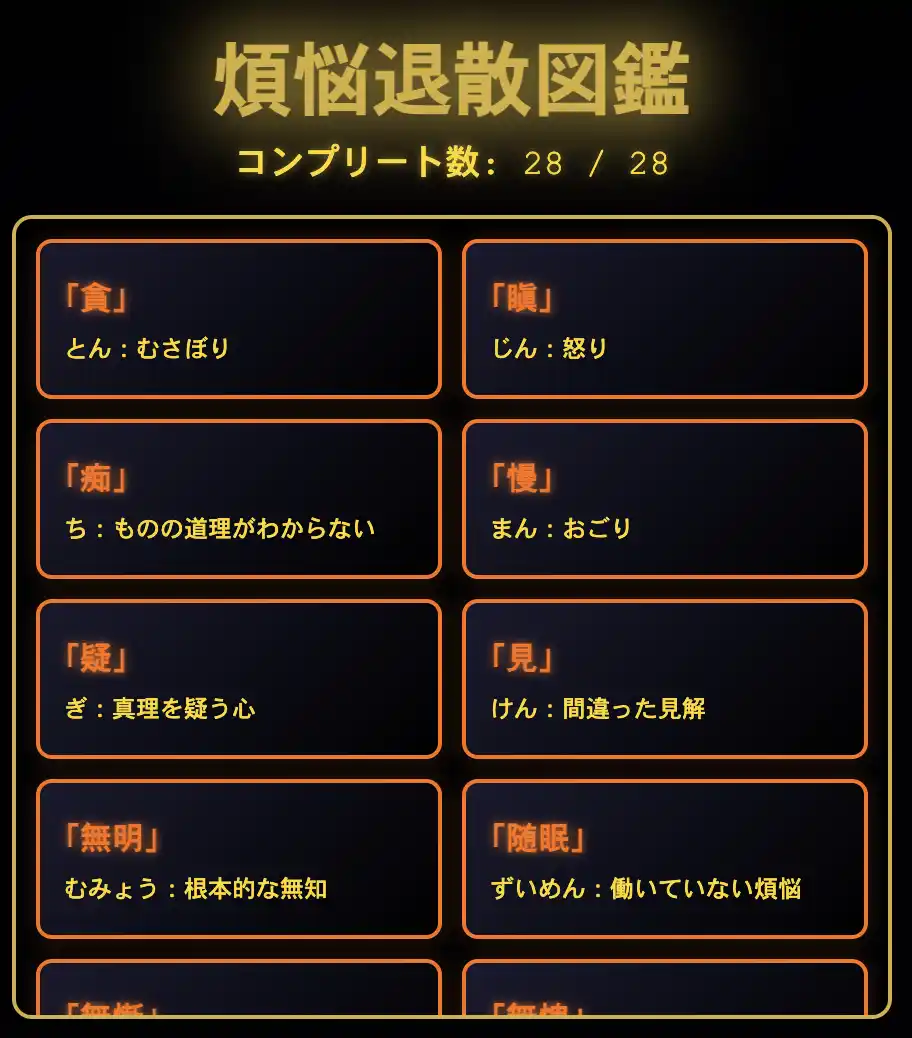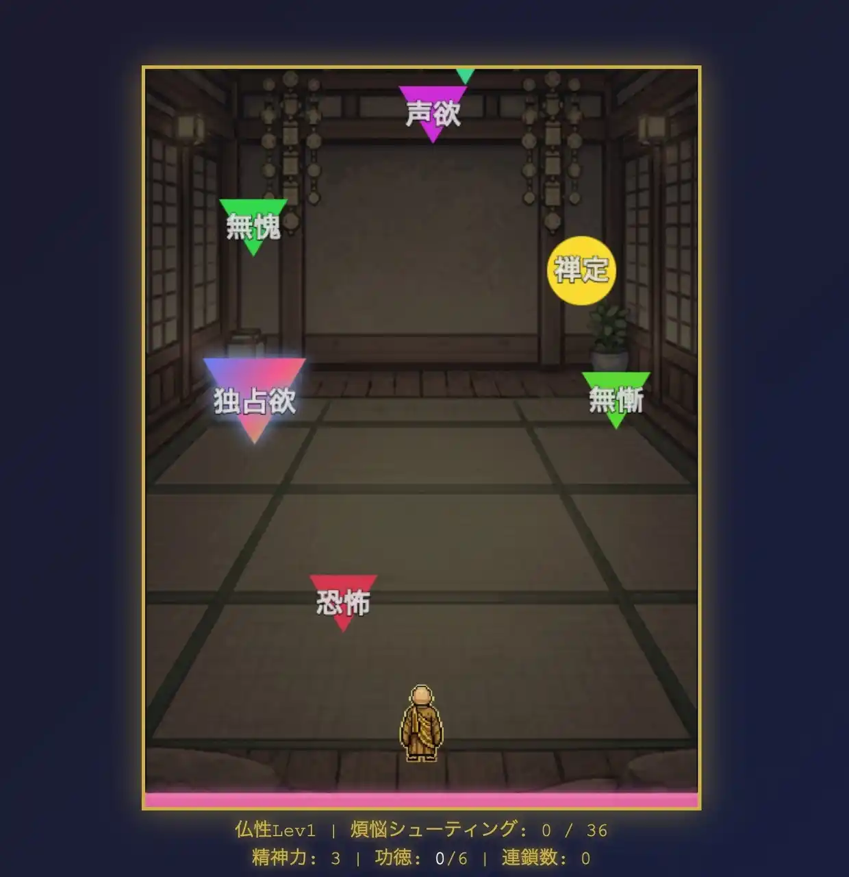 降ってくる煩悩を撃ち落としながら進むブラウザゲームです。 仏教の「煩悩」というテーマを、誰でも楽しめるエンターテインメントとして再構築しました。 |