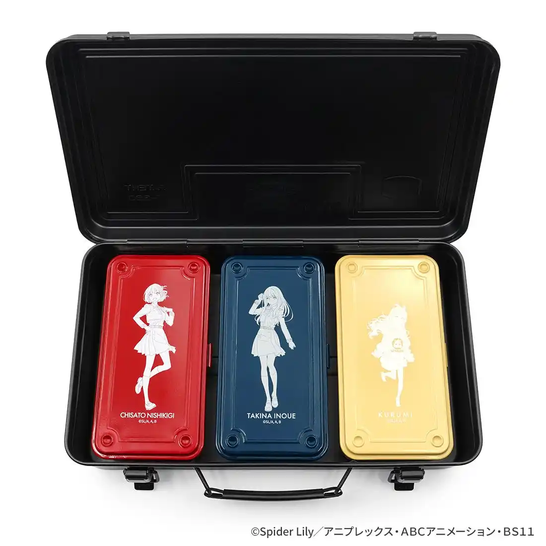 老舗工具箱ブランド「TOYO」とのコラボレーション。DAからの支給品のイメージでデザイン。耐久性優れる人気のトランクタイプ。 同時発売の「千束・たきな・クルミのツールボックス」も3個が収納出来ます。また、クッションを入れて「エアガン」や「フィギュア」等のコレクションアイテムの保管にも便利です。 薄型でスタッキングしやすい設計です。収納できる曲がらないハンドル部。2つあるロック部分は、φ4mmシリンダー錠を取付する事が可能です。 |