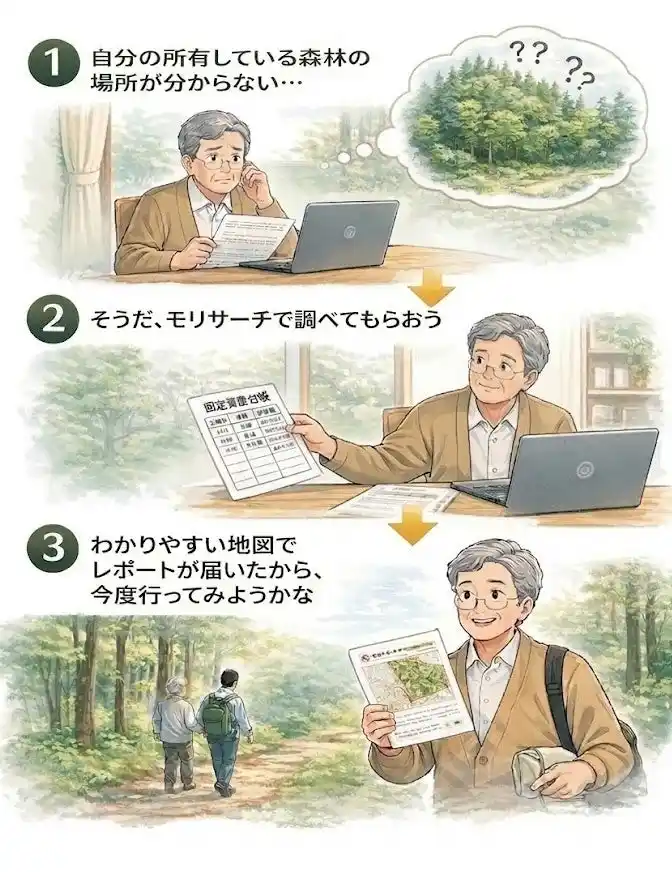 | モリサーチは、固定資産課税台帳や登記情報などの公的資料をもとに、所有している森林の位置を特定するサービスです。 | ||||||||||