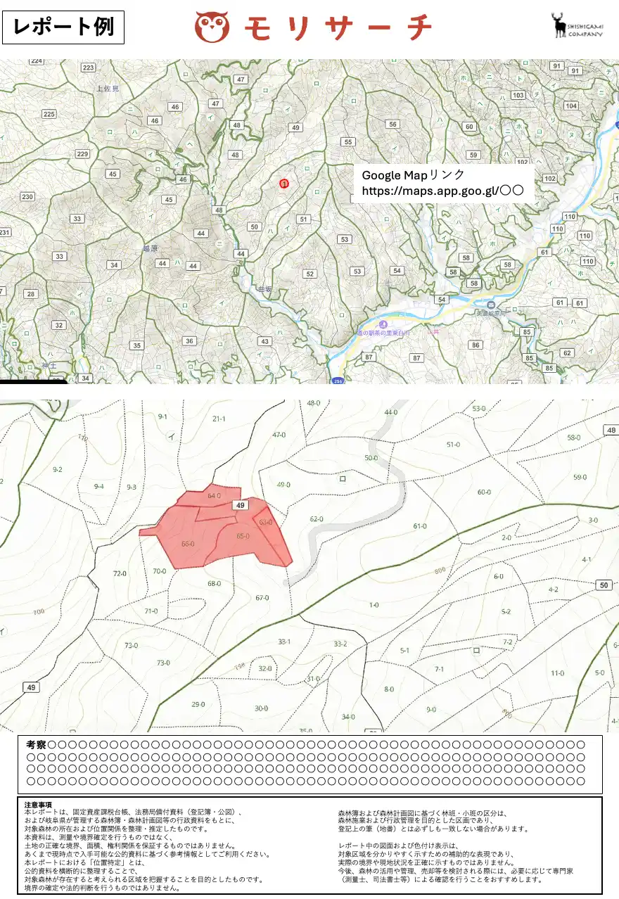 | これらを組み合わせ、対象森林の位置を地図上で可視化したレポートとして提供します。 | ||||||||||
