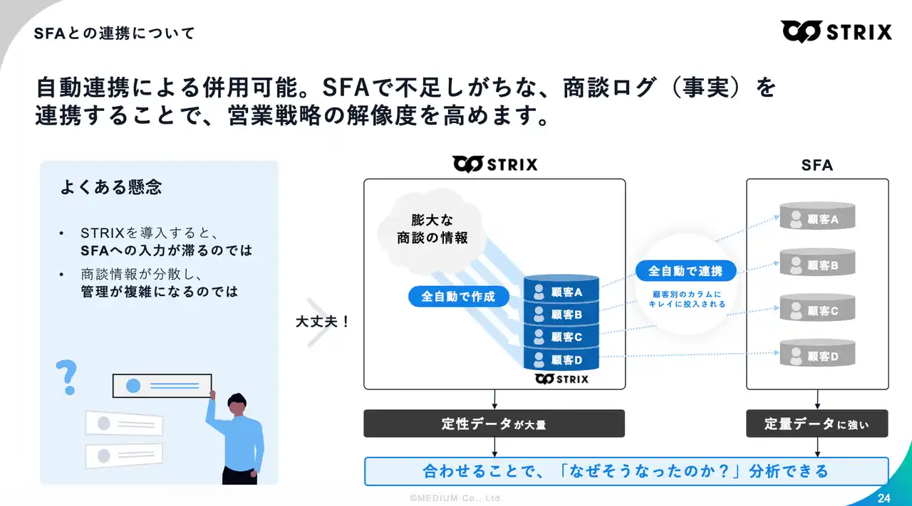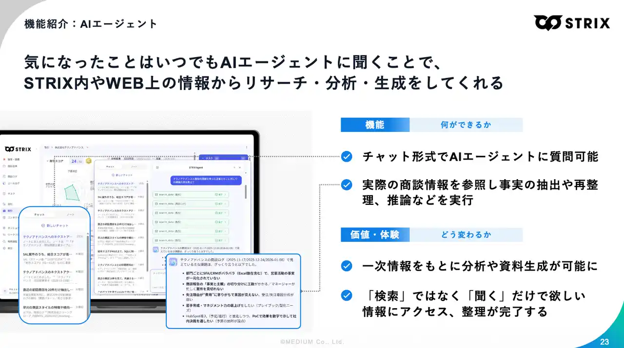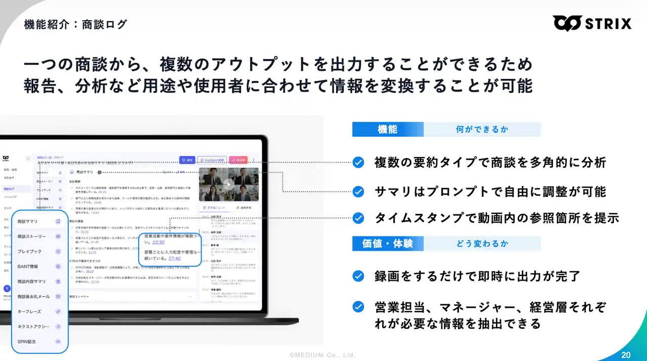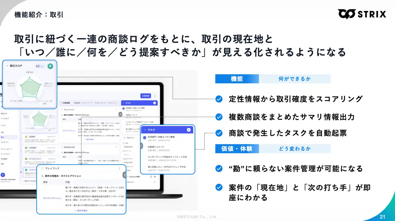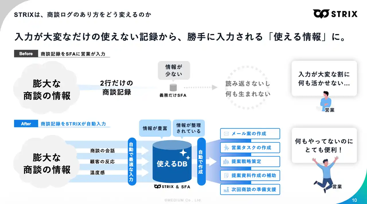 営業戦略のDXを推進する株式会社MEDIUM(本社:東京都渋谷区、代表取締役:関 翔太郎)は、日本の営業組織におけるAI活用の構造的課題を「営業データの欠損」と定義し、商談の一次情報を自動で蓄積・構造化する『STRIX(ストリクス)』をセールスデータプラットフォームとして提供強化することを発表します。 |