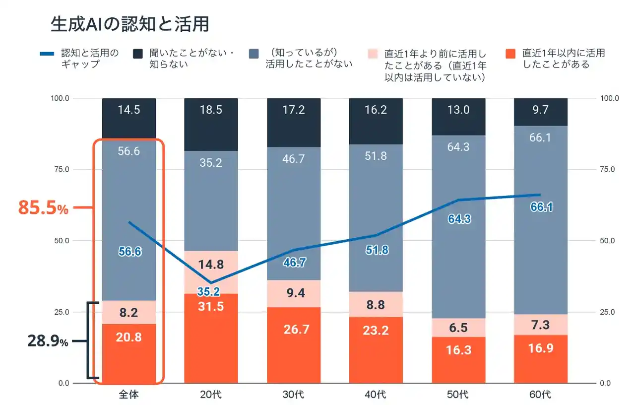 HubSpot「日本の営業に関する意識・実態調査2025」(第6回)によると、営業活動における生成AIの活用率は28.9%です。前年の21.1%からは改善したものの、企業全体のAI導入率57.7%との間には依然として約29ポイントの断絶があります(※3)。 |