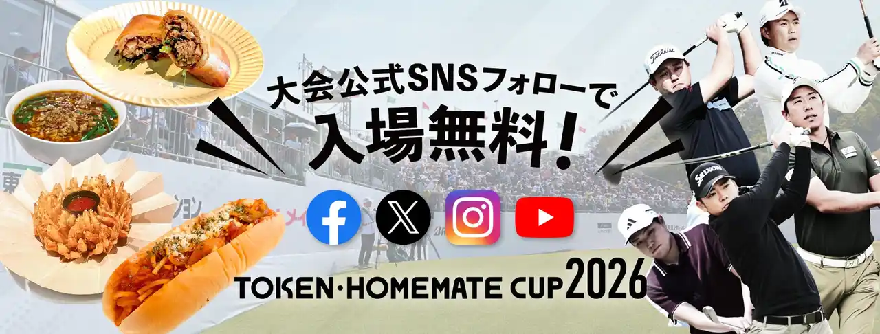 JAPANゴルフツアー公式のプロゴルフトーナメント、男子ゴルフツアー開幕戦「東建ホームメイトカップ」の公式SNS(X・Instagram・Facebook・YouTube)のいずれかをフォローしていただくと、どなたでも入場料が【無料】になります!トッププレーヤーたちの熱い戦いを間近で体感できる絶好のチャンス。 |