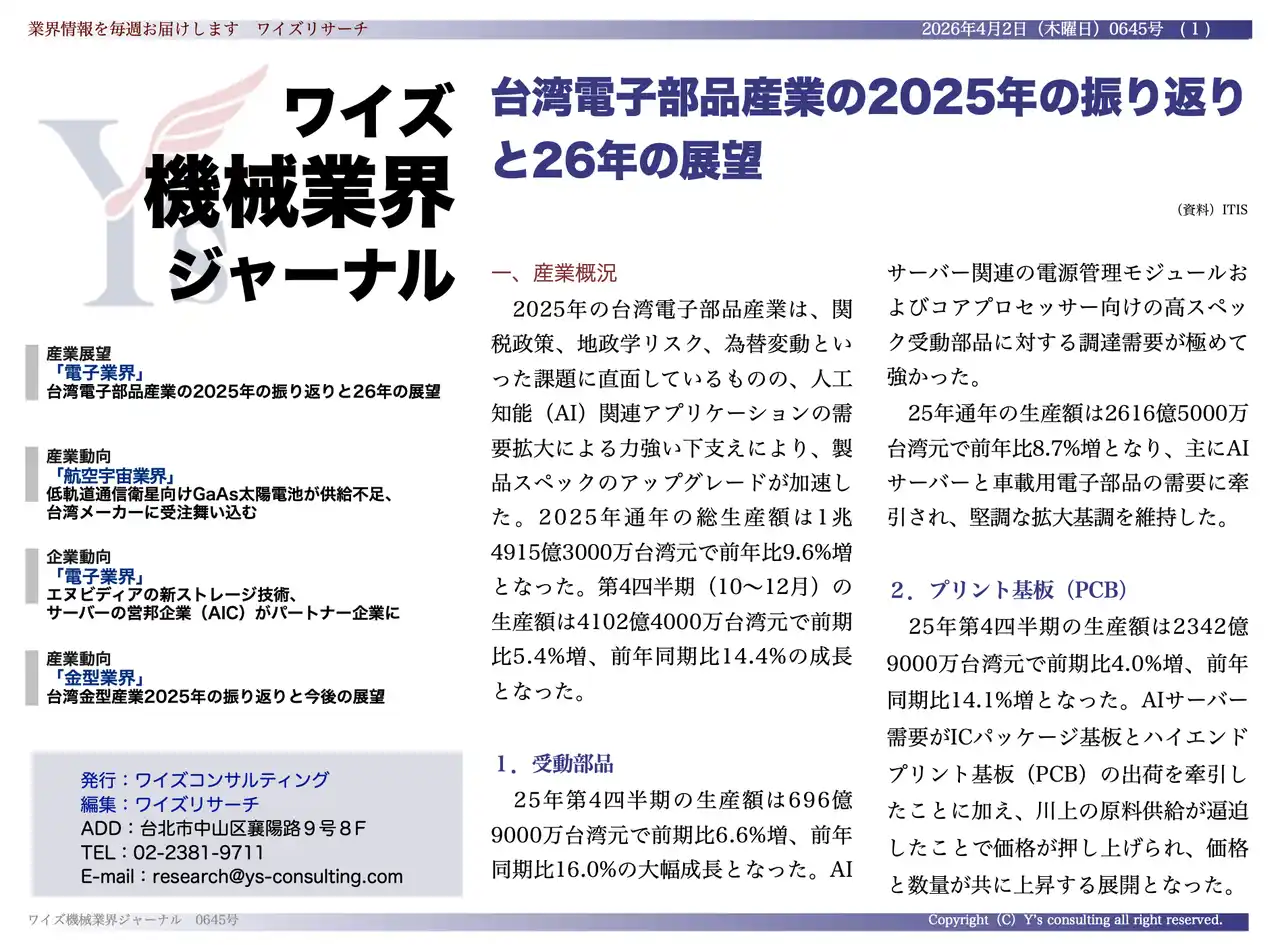 | ワイズコンサルティング グループ(本社:中華民国台北市、代表取締役:吉本康志)は台湾機械業界専門誌「ワイズ機械業界ジャーナル」の2026年4月第1週号を発行しました。 | |||||||||