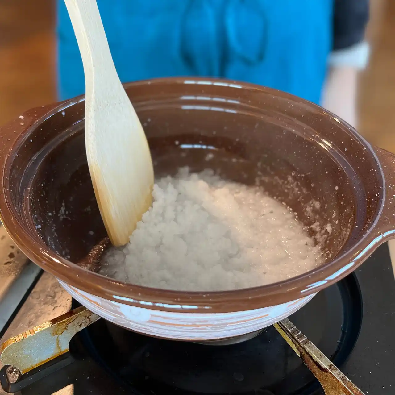 AMAMI TERRACEの店舗内で、塩を炊いて味わいを感じることができる、実演販売をしています。1日4時間程度じっくり炊き上げ、大粒の塩に仕上げています。 |