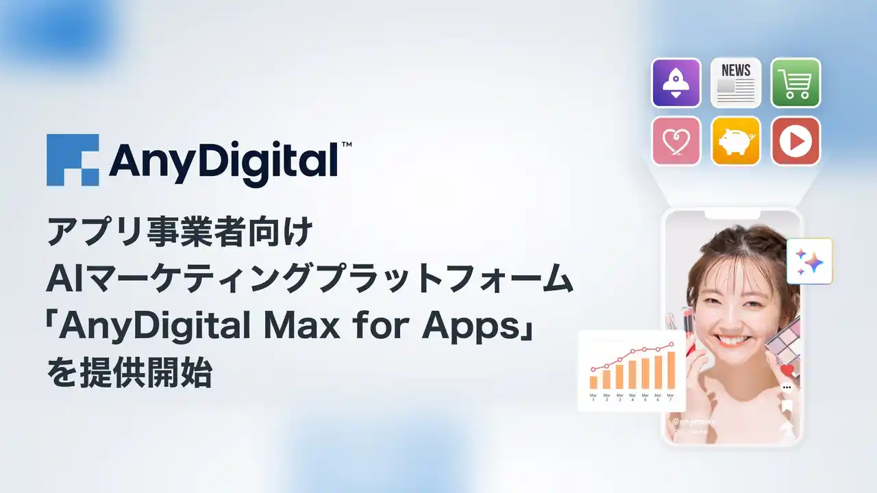 AnyMind Group株式会社(読み:エニーマインドグループ、代表取締役CEO:十河 宏輔、以下「当社」)は、デジタルマーケティングプラットフォーム「AnyDigital」を基盤にしたアプリ事業者向けAIマーケティングプラットフォーム「AnyDigital Max for Apps」の提供を開始しました。 |