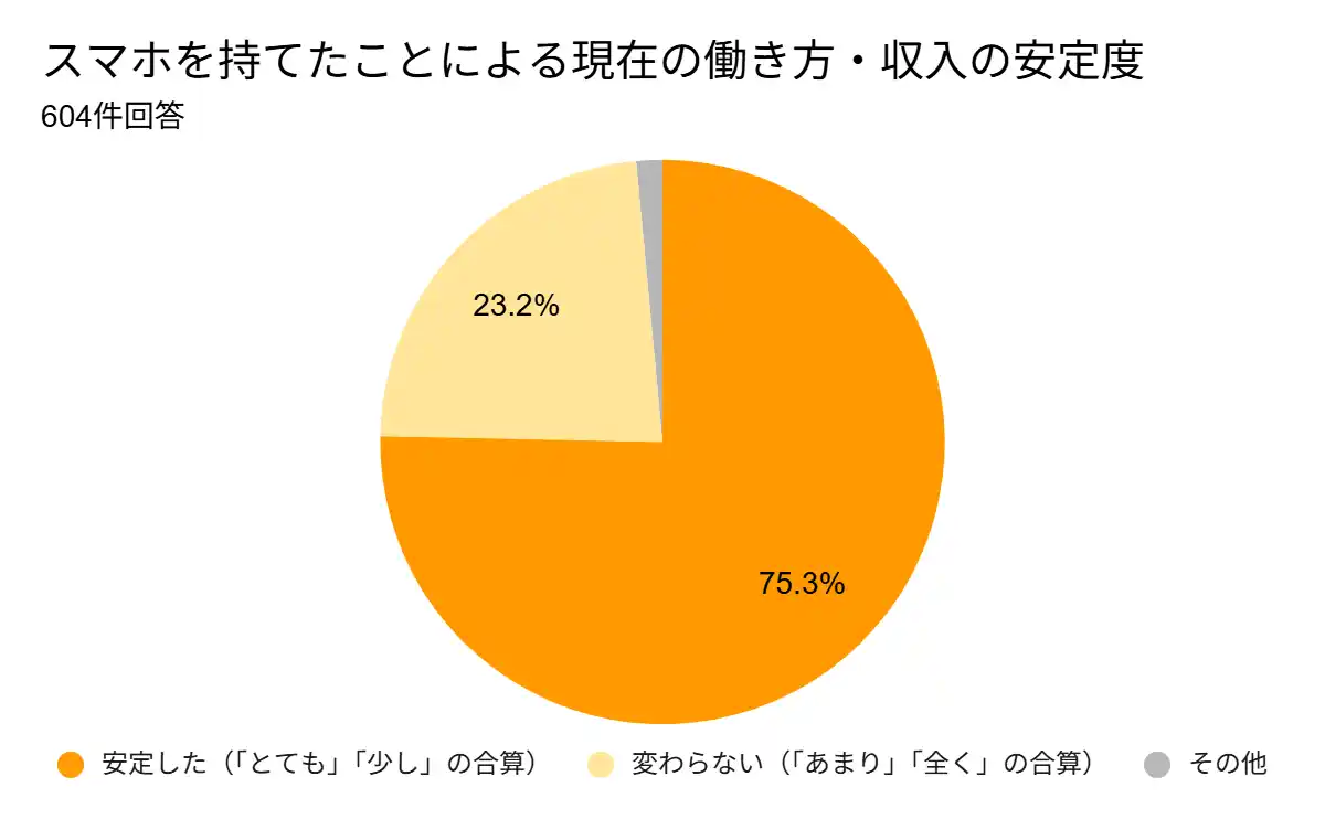 そして、一度は労働市場から遠ざけられた人々も、スマートフォンを再び手にしたことで状況は大きく好転しています。スマホを持てたことで現在の働き方や収入が「少し安定した」「とても安定した」と回答した人の合計は455名に達しました。 |