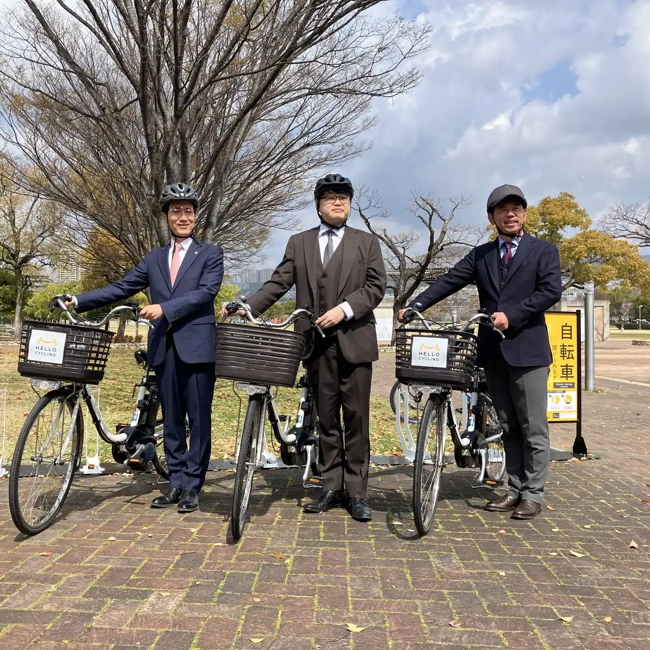 3月30日(月)、宝塚市役所でOpenStreet、宝塚市、川西市による本協定の合同協定締結式を実施しました。合同協定締結式では、宝塚市の森市長から「幅広い世代の方が利用できるシェアサイクルを、公共交通を補完・代替としての機能だけでなく、地域活性化、観光振興に資する取り組みとして、その有効性や課題をOpenStreetと連携して、研究していきたいです」とコメントをいただきました。合同協定締結式終了後には、近隣ステーションへ移動し、HELLO CYCLINGについての説明や記念撮影を実施しました。 |