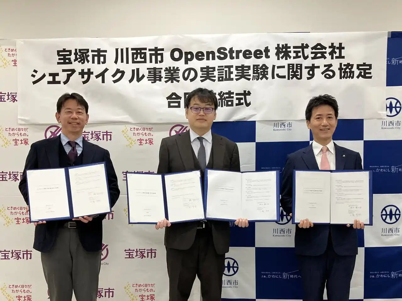 OpenStreet株式会社(本社:東京都港区、代表取締役社長CEO:工藤 智彰、以下「OpenStreet」)は、兵庫県宝塚市(市長:森 臨太郎)と、兵庫県川西市(市長:越田 謙治郎)と、『シェアサイクル事業の実証実験に関する協定(以下、「本協定」)』を締結し、国内最大級のシェアサイクルサービス「HELLO CYCLING」を活用した実証実験を2026年4月から開始したことをお知らせします。 |