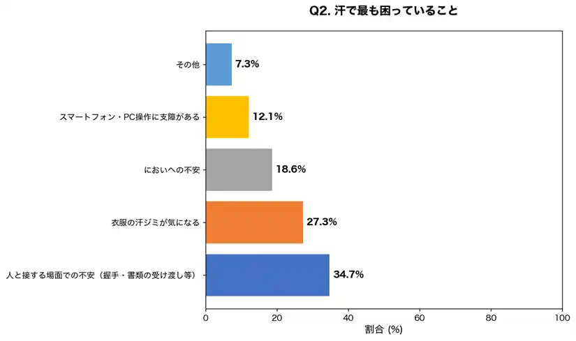 | 対人場面での不安が最も多く、多汗症が精神的なストレスや社会生活への影響を与えていることがわかります。特にビジネスシーンでの握手や書類の受け渡しに困っている方が多く、仕事への影響も無視できません。 | ||||||||||||||||||||||||||||||||