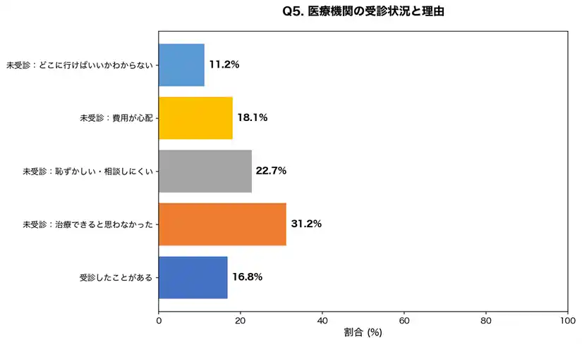 | 83.2%が未受診という結果は深刻です。「治療できると思わなかった」という回答が最多であることから、多汗症が医療的に治療可能な疾患であるという認識自体が広まっていないことがわかります。また「どこに行けばいいかわからない」という回答も11.2%あり、適切な受診先の周知も課題です。 | ||||||||||||||||||||||||||||||||