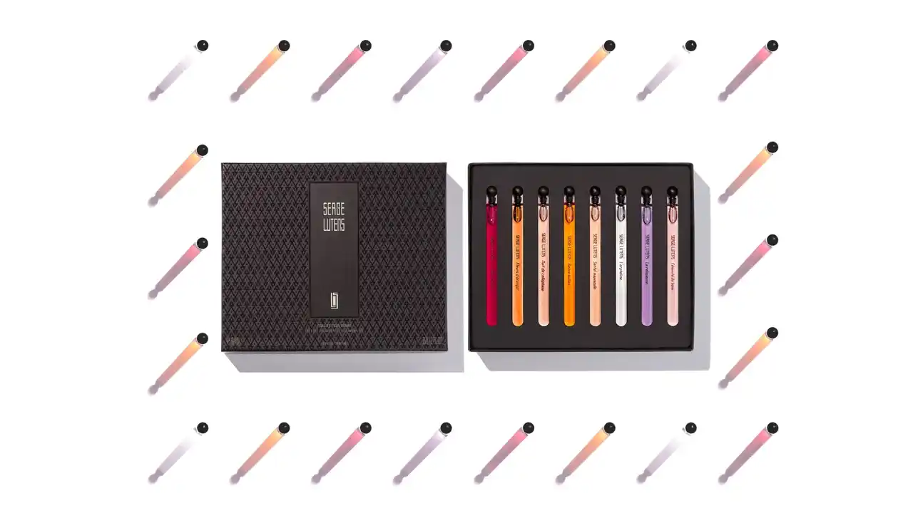 セルジュ ルタンスのシグネチャーラインであるコレクションノワールから、繊細なカラーで彩られた、鋭利な短剣を思わせる8本のフラコン。神話的ともいえる8つの香りのクリエイションが、ここに集結。* |