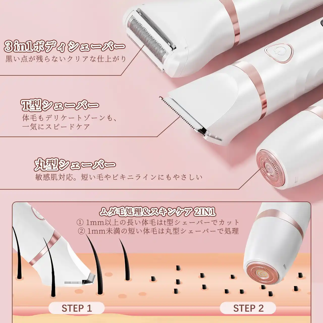 ・T字・I字・往復式の3種ヘッドでフェイス・ボディ・VIO対応。 |