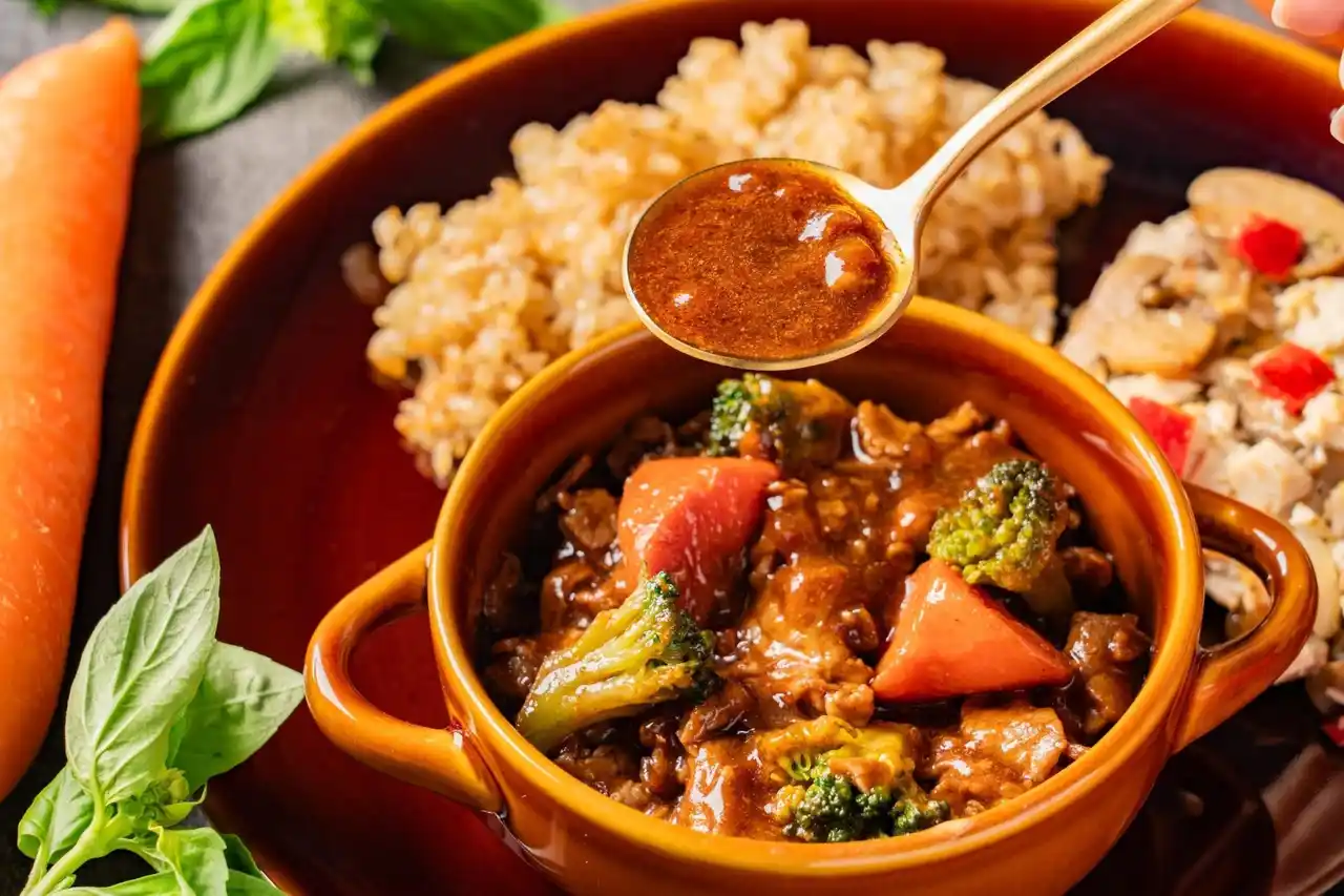 牛肉の旨みと、スイートワインを合わせたデミグラスソースが織りなすコク深い贅沢な味わいが特徴の「ビーフストロガノフ」。ごろっとした人参やブロッコリーが彩りを添え、食感と栄養も満足の一品です。 |