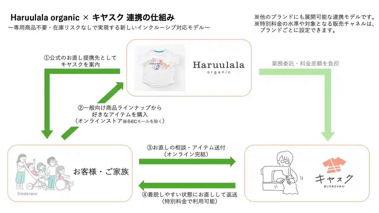 障害や病気のある人向けの服のお直しサービス「キヤスク」を起点に、アパレルブランドのインクルーシブな服づくりやアフターサービスを支援する株式会社キヤスク(千葉県習志野市、代表取締役社長:前田哲平)は、アパレルブランドが顧客に対して「キヤスク」を商品購入後の公式なお直し先として案内できる、お直し提携サービスを新たに開始しました。本取り組みにより、キヤスクとの提携ブランドは、障害や病気などで服の着脱に不自由を抱えているお客様に対しても、購入後の「キヤスクでのお直し」という選択肢を公式案内することで、一般のお客様向けと同じ商品ラインナップを提案できるようになります。 |