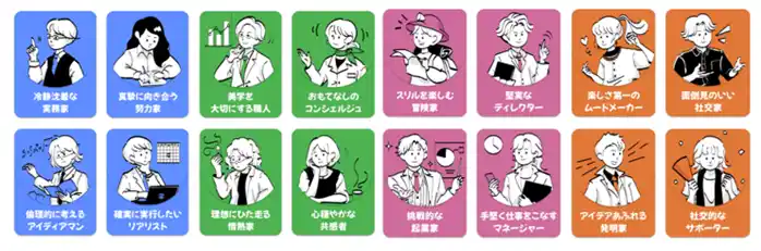 自己理解を深められる「特性診断」を通じ、自身の性格や価値観に合った求人に出会えます。特性診断は、人間の性格はいくつかのタイプに分類することができるという「類型論」に基づいた分析で、16タイプのうち、個人に最も強く適合する「1位から3位まで」の適合タイプが表示されます。検査結果には、自身に適合する3タイプの性格や強みが記載されているため、自己理解を深めることに役立ちます。 |