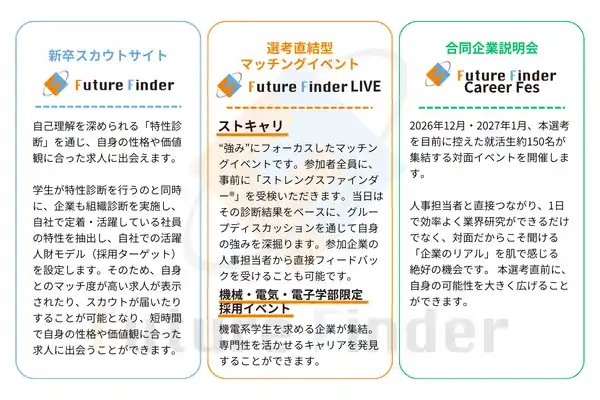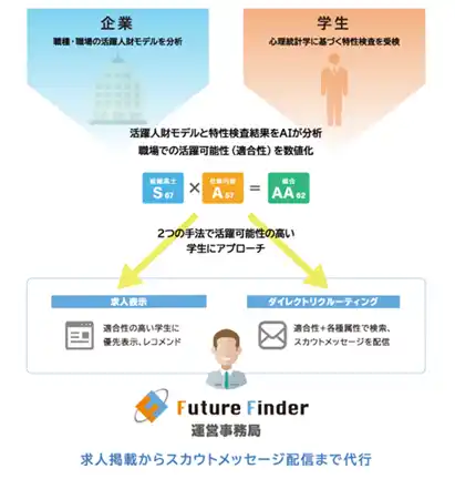 「Future Finder(R)」は、心理統計学を活用した診断エンジンを用いて、採用企業と学生とのマッチングを生み出す就職支援サイトです。 サイトURL:https://futurefinder.net/