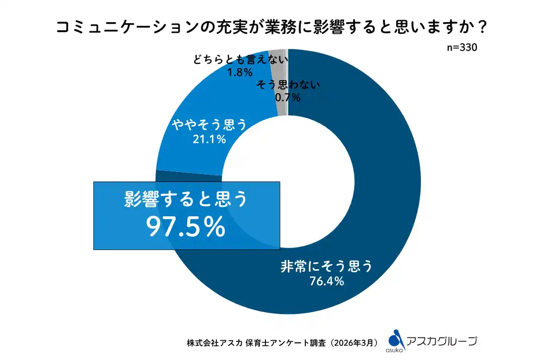 その結果、保育士の約8割がコミュニケーションに関する悩みを抱えた経験があることが分かりました。さらに97.5%が「業務に影響する」と回答しており、保育現場における重要な課題が明らかになりました。 |