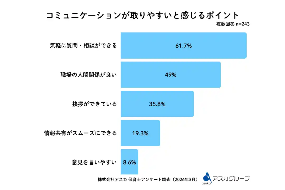 保育業界に特化した人材サービスを全国で展開する株式会社アスカ(本社:群馬県高崎市、代表取締役会長:加藤秀明)は、保育士を対象に「職場のコミュニケーション」に関するアンケート調査を実施いたしました。 |