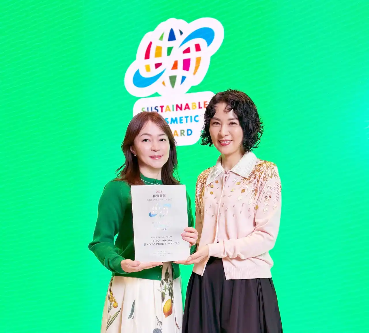 当日は、業界の第一線で活躍する有識者らによるトークセッションが行われ、日本の名だたるサステナブルコスメが一堂に会する中、本商品の立案・監修にも携わり、青パパイヤの魅力を広く伝える「日本青パパイヤ協会」会長のパパイヤ知美氏がブランドを代表して出席し、「審査員賞(コストパフォーマンス部門)」の表彰を受けました。 |