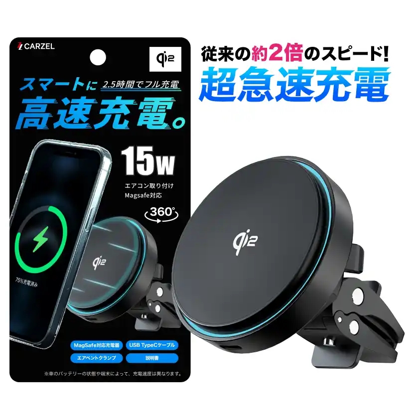 車内でも快適・スマートに充電できる「CARZEL Magsafe ワイヤレス車載充電器」。 |
