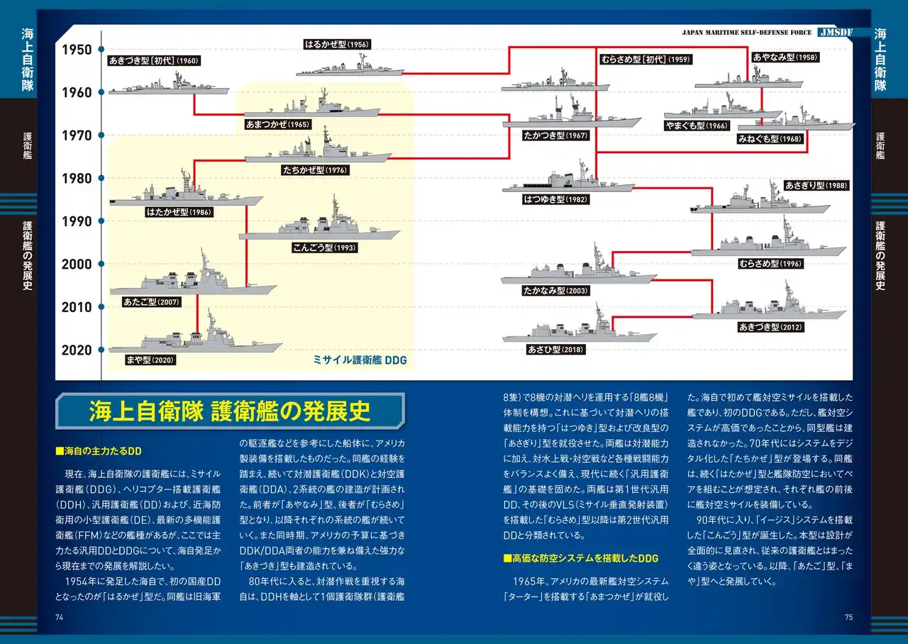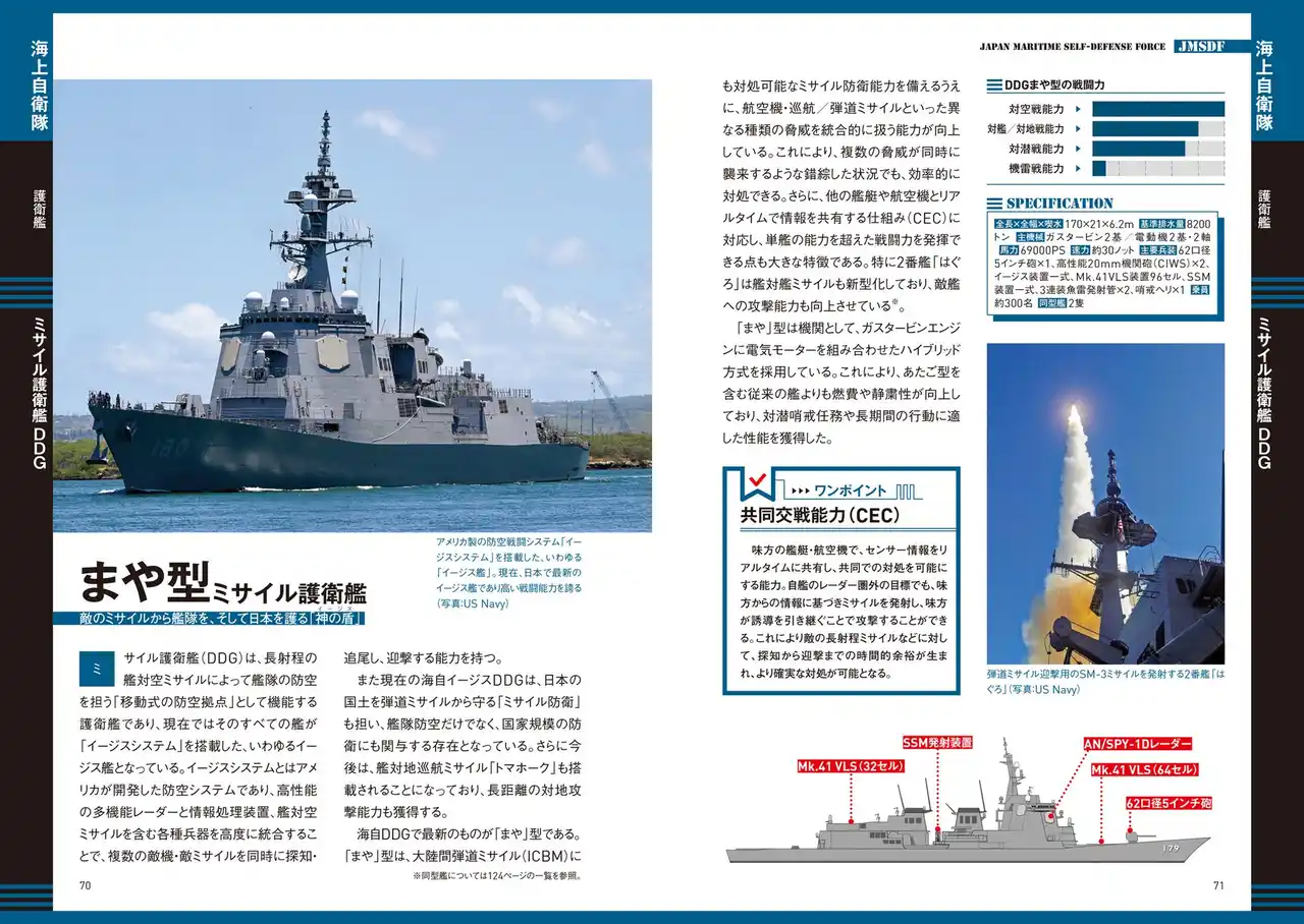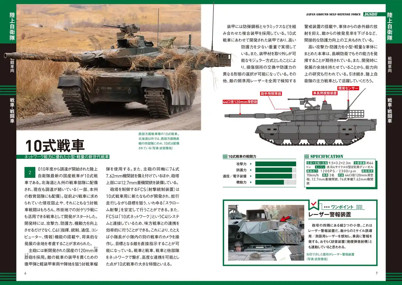 各装備には詳細スペックに加え、性能がひと目でわかる「戦闘力グラフ」を掲載。さらに戦車・装甲車、護衛艦、戦闘機は、自衛隊創設時から現代までの発達の流れをイラスト付きチャートで解説、時代背景を踏まえて、それぞれがどのように進化してきたかを知ることができます。単なる図鑑にとどまらない、“理解できる装備ガイド”です。 |