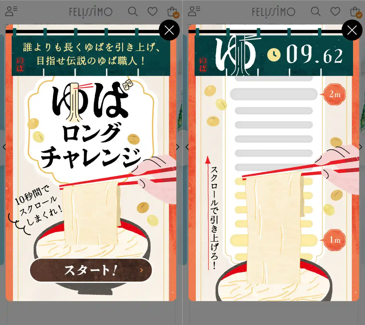 4月1日(水)のエイプリルフールより、フェリシモ公式WEBサイトのトップページにて、ゆばの引き上げを体験できる特設ゲーム「ゆばロングチャレンジ」を公開中。 |