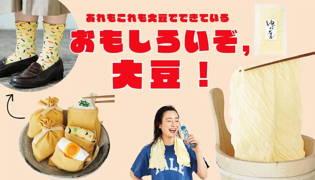 フェリシモが展開するユーモア雑貨ブランド「YOU+MORE!」は、大豆の驚くべき変貌ぶりに着目した新作アイテム「ゆばタオル」と「油あげ巾着ソックス」のウェブ販売を3月25日より開始しています。豆腐、豆乳、油あげなど、おどろくほど多様な姿で毎日の食卓を支える「大豆」をモチーフに、日常で楽しめる雑貨に落とし込んだ新作アイテム2点です。