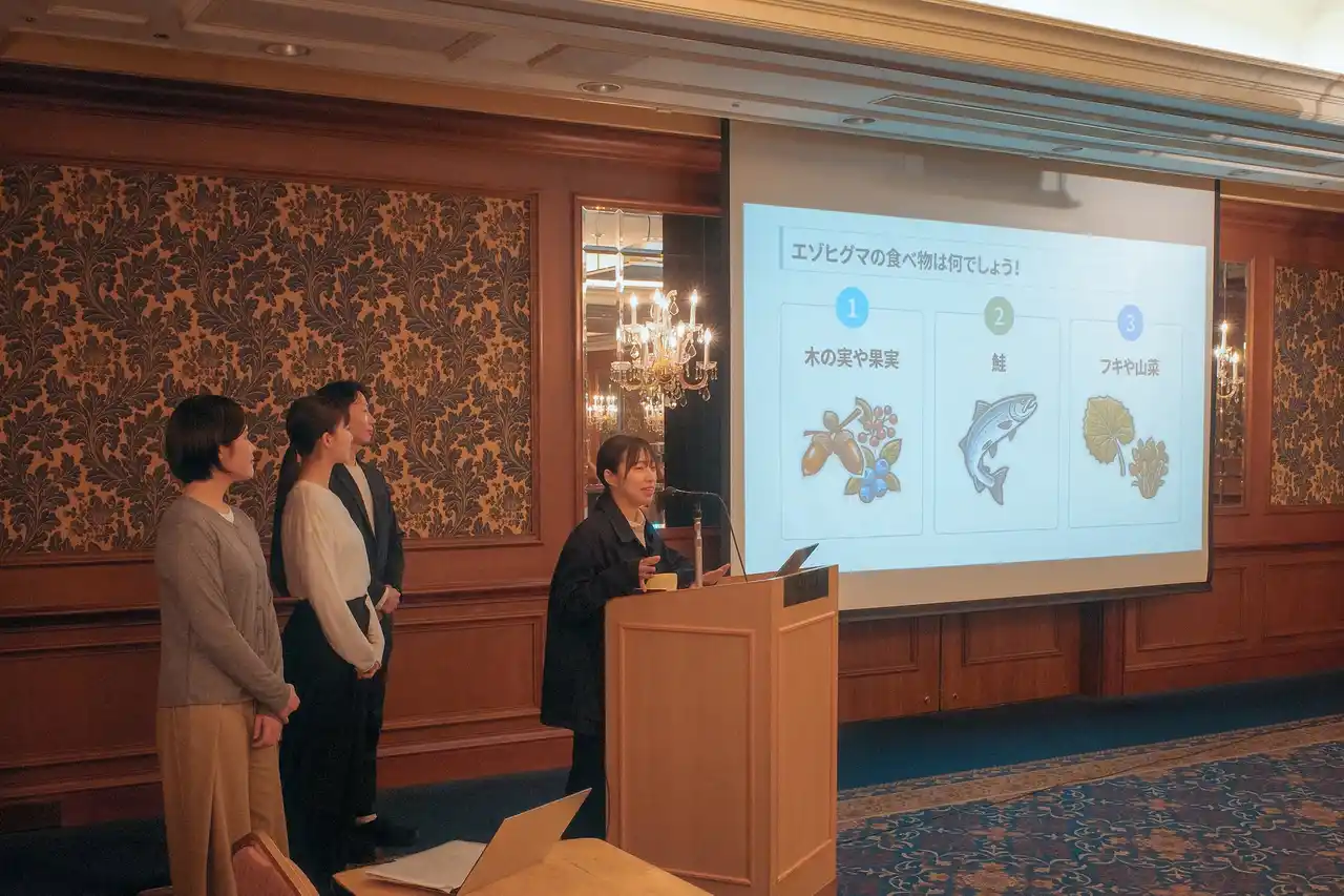 | 旭山動物園での新入社員研修参加後に、25年度入社社員4名によるオリジナルの「旭山動物園講座」を企画・発表しました。発表の際には、26年度新入社員6名も参加し、今後担当する「旭山動物園講座」の取り組みをゲスト目線で体感。今後のサービスに役立てていきます。 | |||