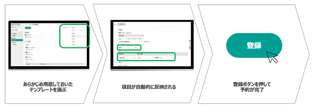 | 拠点・バース・品目・物量・時間帯など、予約フォームの内容をテンプレートとして保存できます。 | |||