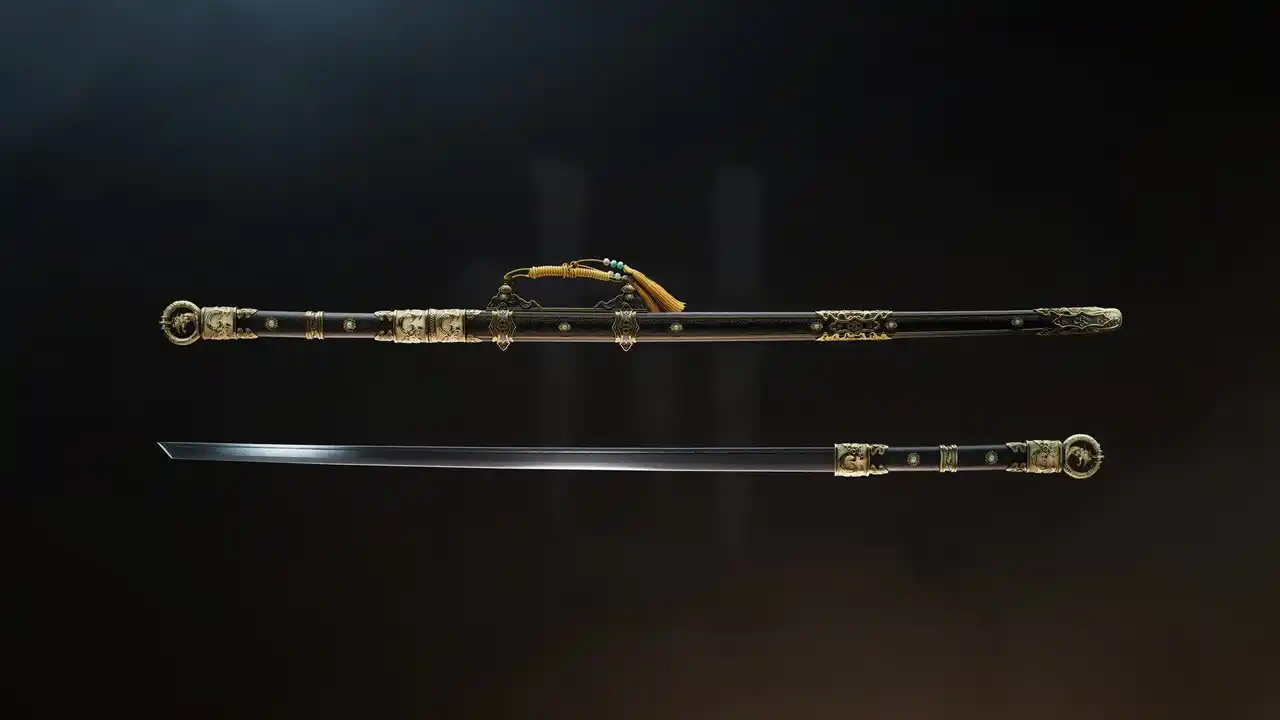 | 幾重にも鍛え上げられた直線的な切っ先と鋭い刃を備えた、剛毅で端正な佇まいが特長です。しなやかな曲線を描く湾刀とは異なる魅力を持ち、栄華を極めた唐代の気風と美意識を感じさせる一振りとして描かれています。 | |||