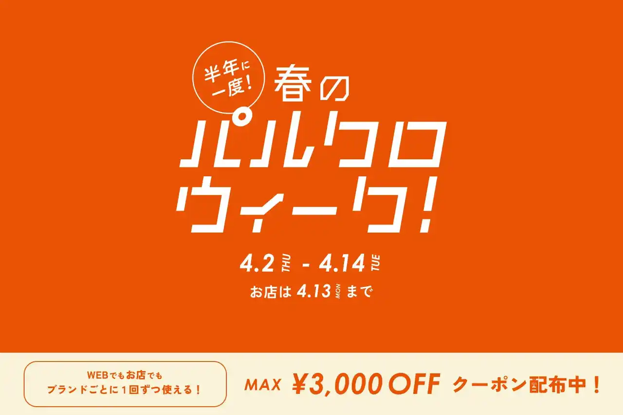 最大3,000円OFF!店舗とオンライン、それぞれで使えるクーポン配布 ! 期間中、パルグループの店舗とパルクローゼットでブランドごとに1回ずつ使える大変お得なクーポンをプレゼント! |