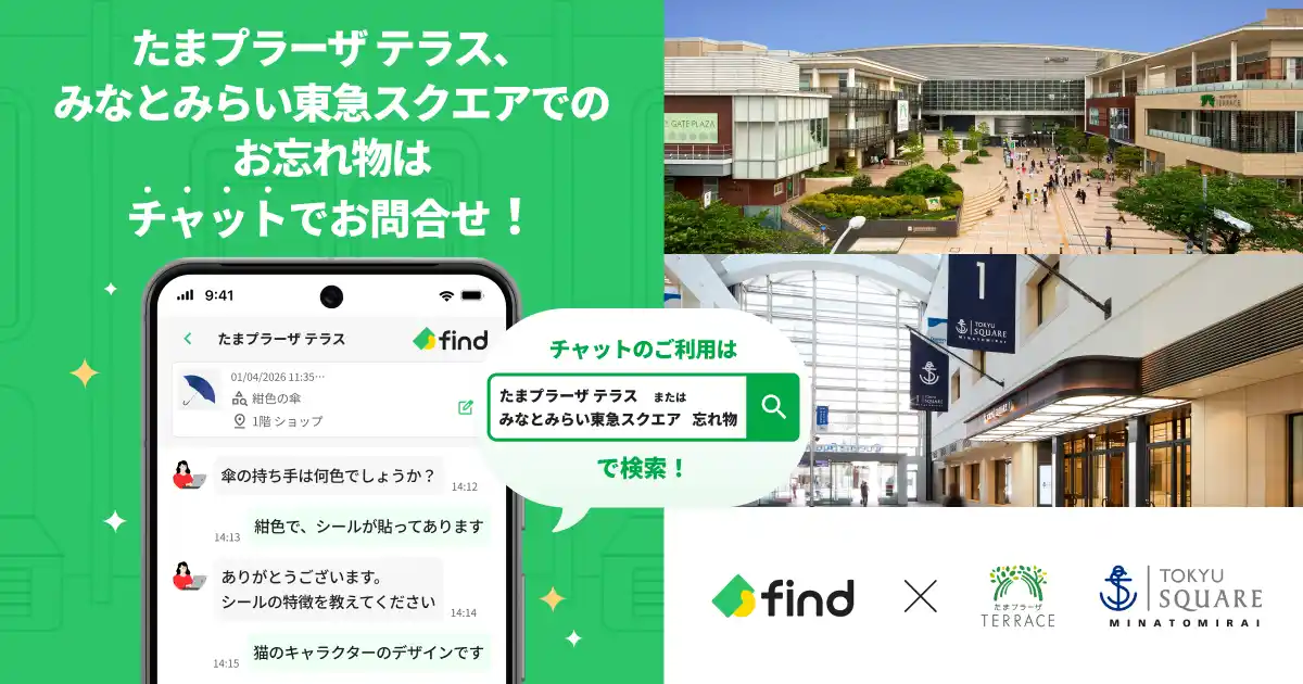 株式会社東急モールズデベロップメント(本社:東京都渋谷区、代表取締役社長:小山 晃司、以下「東急モールズデベロップメント」)が運営する商業施設「たまプラーザ テラス」「みなとみらい東急スクエア」は、2026年4月1日より株式会社find(本社:東京都港区、代表取締役CEO:高島 彬、以下「find」)が提供する「落とし物クラウドfind」を導入しました。 |
