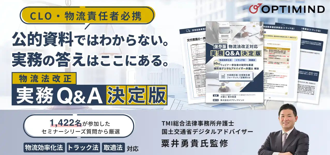 | 「温かい社会を、技術と支える」をミッションとする株式会社オプティマインド(以下、オプティマインド)は、物流関連二法および取適法の改正に伴い、物流責任者・実務者が直面する具体的な疑問に対する判断基準をまとめたガイドブック『物流法改正実務Q&A決定版』を公開しました。 | |||||||||