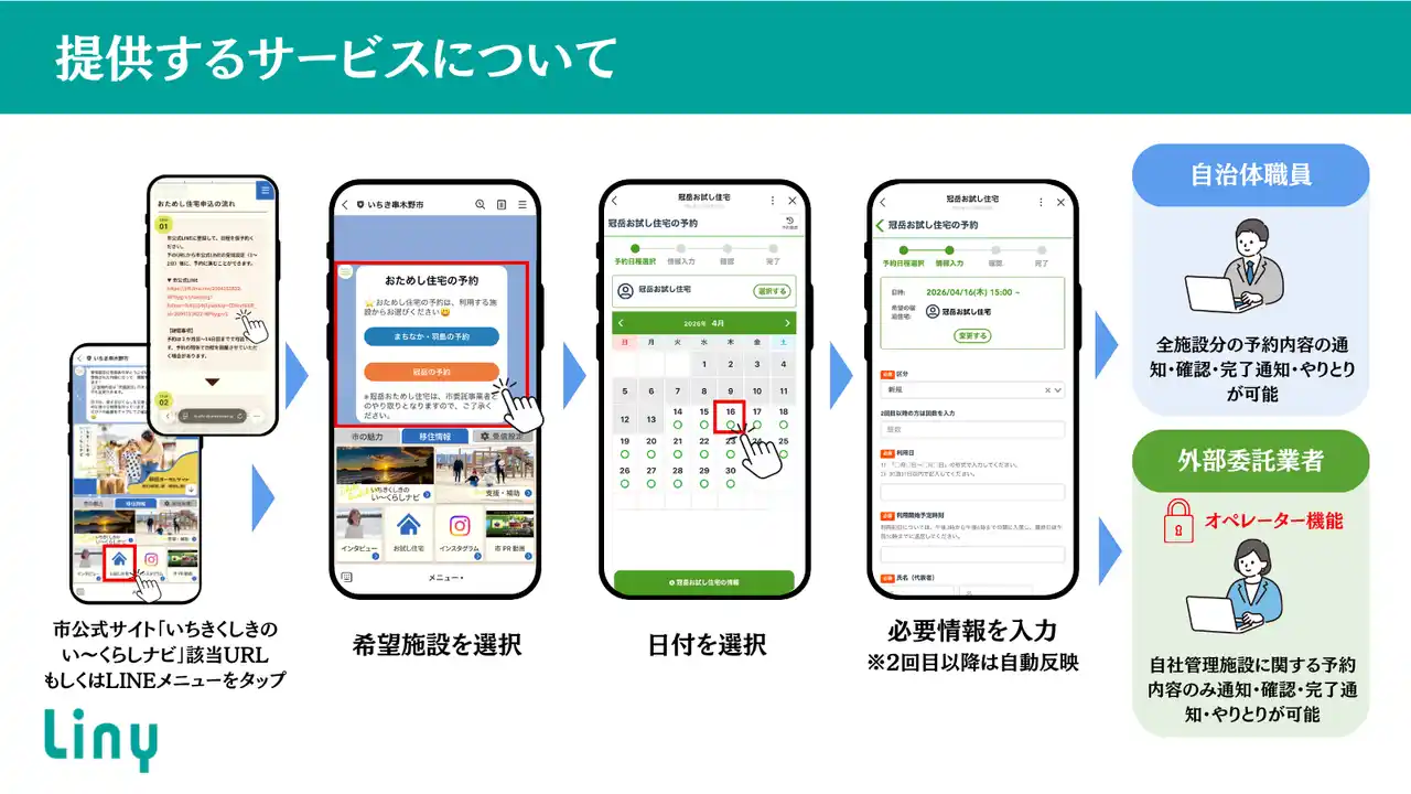 この度、株式会社アローリンク(代表取締役:伊藤俊輝)は、鹿児島県いちき串木野市(市長:中屋謙治)のLINE公式アカウントにおいて、移住検討者に向けた「お試し住宅」の利用予約をLINE上で完結できる仕組みを構築し、運用を開始したことをお知らせします。 |