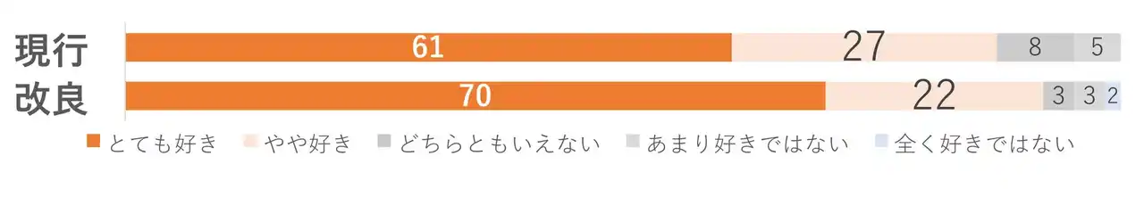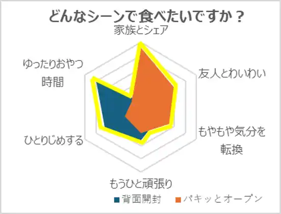 本仕様について、従来の背面からの開け方と開封時の爽快感(*3)を比較したところ、本仕様は爽快感の項目が有意に高値を示しました。背面には従来の開封口もあるため、これまでの1枚をひとりじめする食べ方も出来ますし、2Wayの開け方によって、様々なシーンに合わせた食べ方もできる新しいパッケージになっています。 |