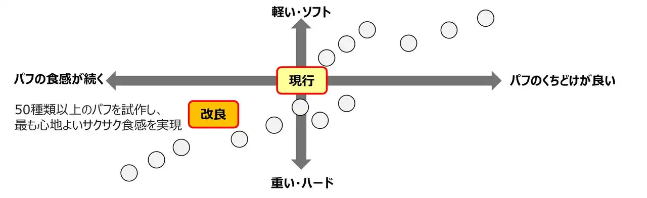 構成要素である「でん粉」の種類を変更したモルトパフを複数種類作成し、食感のマッピングを作りました。マッピングの中で現行よりもサクサク食感が持続する方向に着目し、食感を強化しました。 |