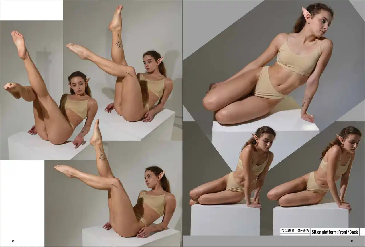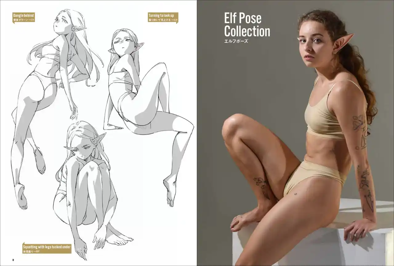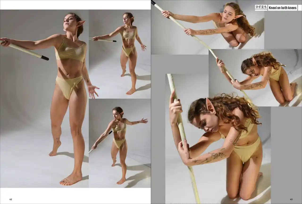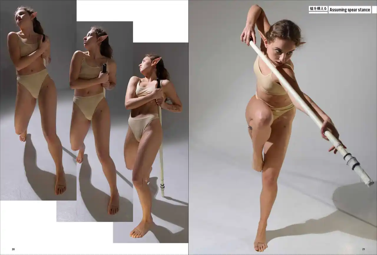 第一弾は「妖精・エルフ」。エルフの耳をつけて動き、様々なポーズをあおり、ふかん、連写など複数の画角で撮影しています。描くのが難しい「エルフ耳」の向きや位置も本書では一目瞭然。輪郭ラインのわかる水着と鍛えた筋肉で、戦うポーズから水辺でくつろぐポーズまで、バリエーション豊かなシチュエーションと動きを網羅します。 |