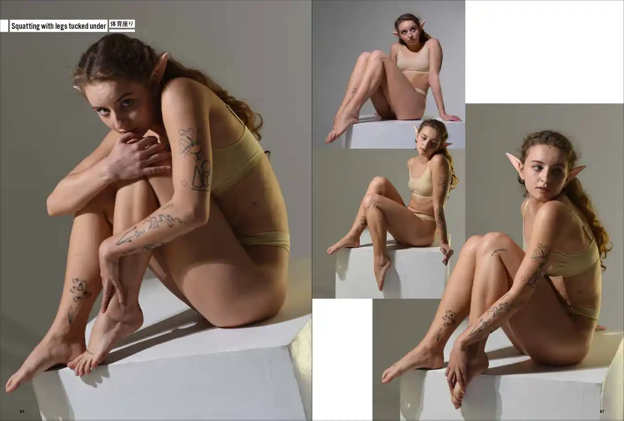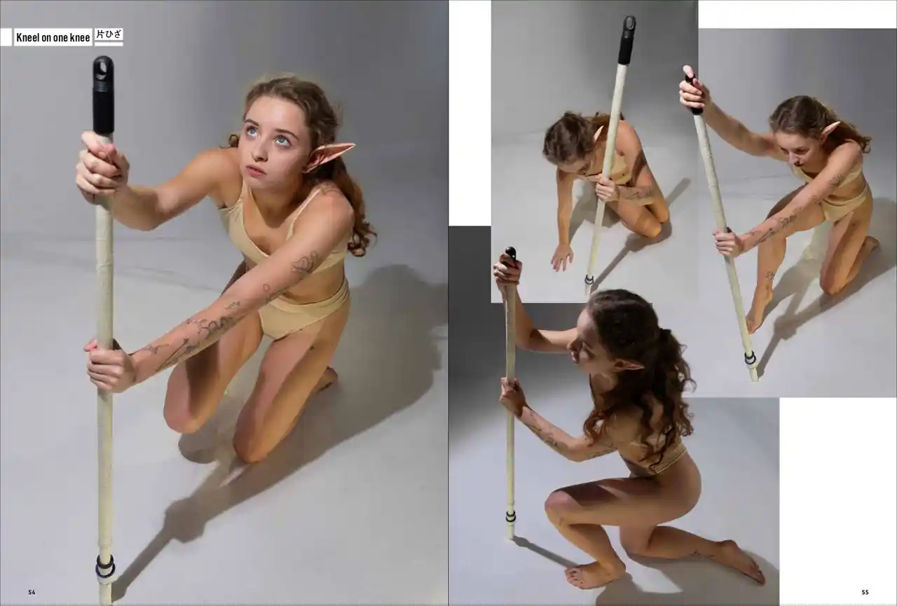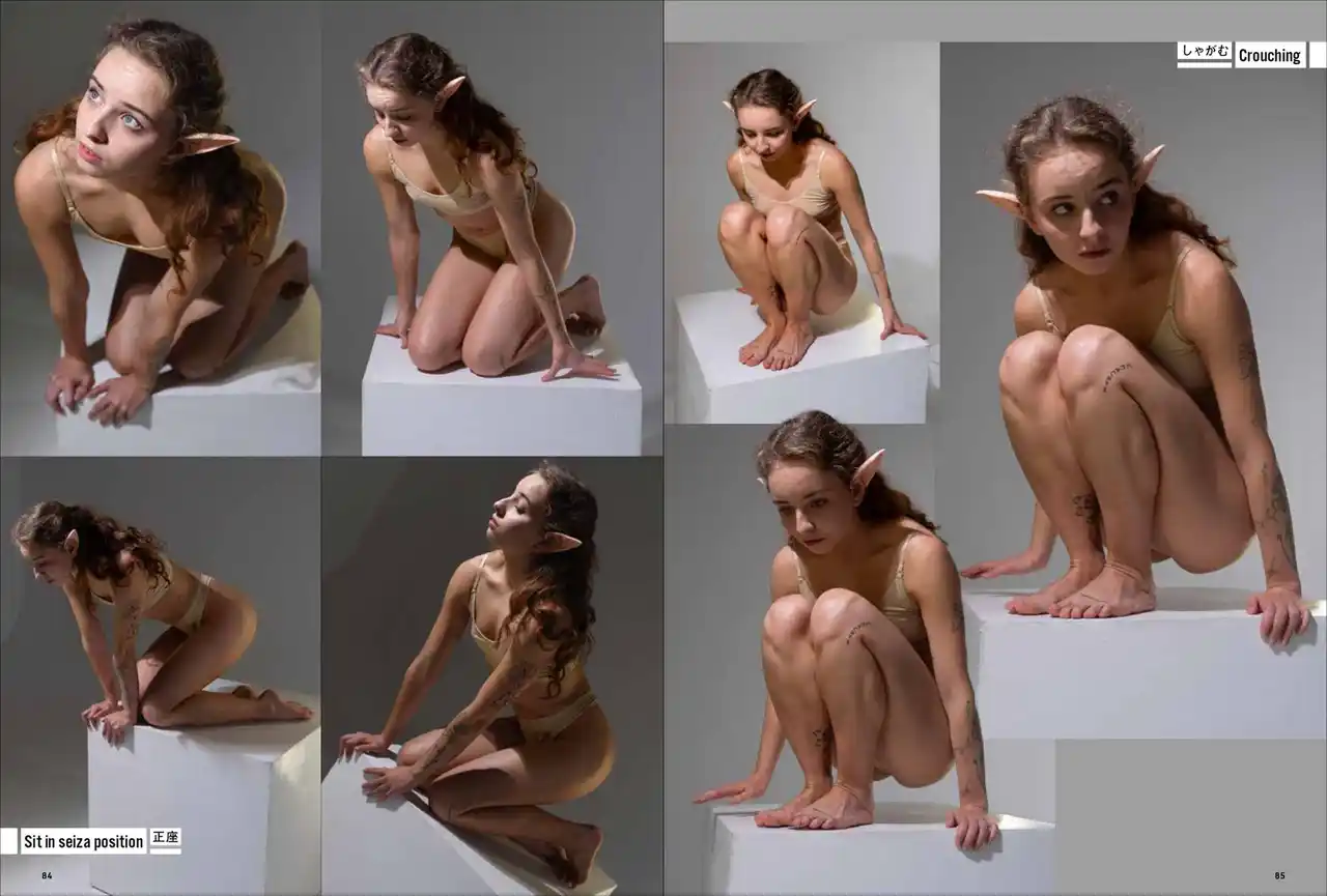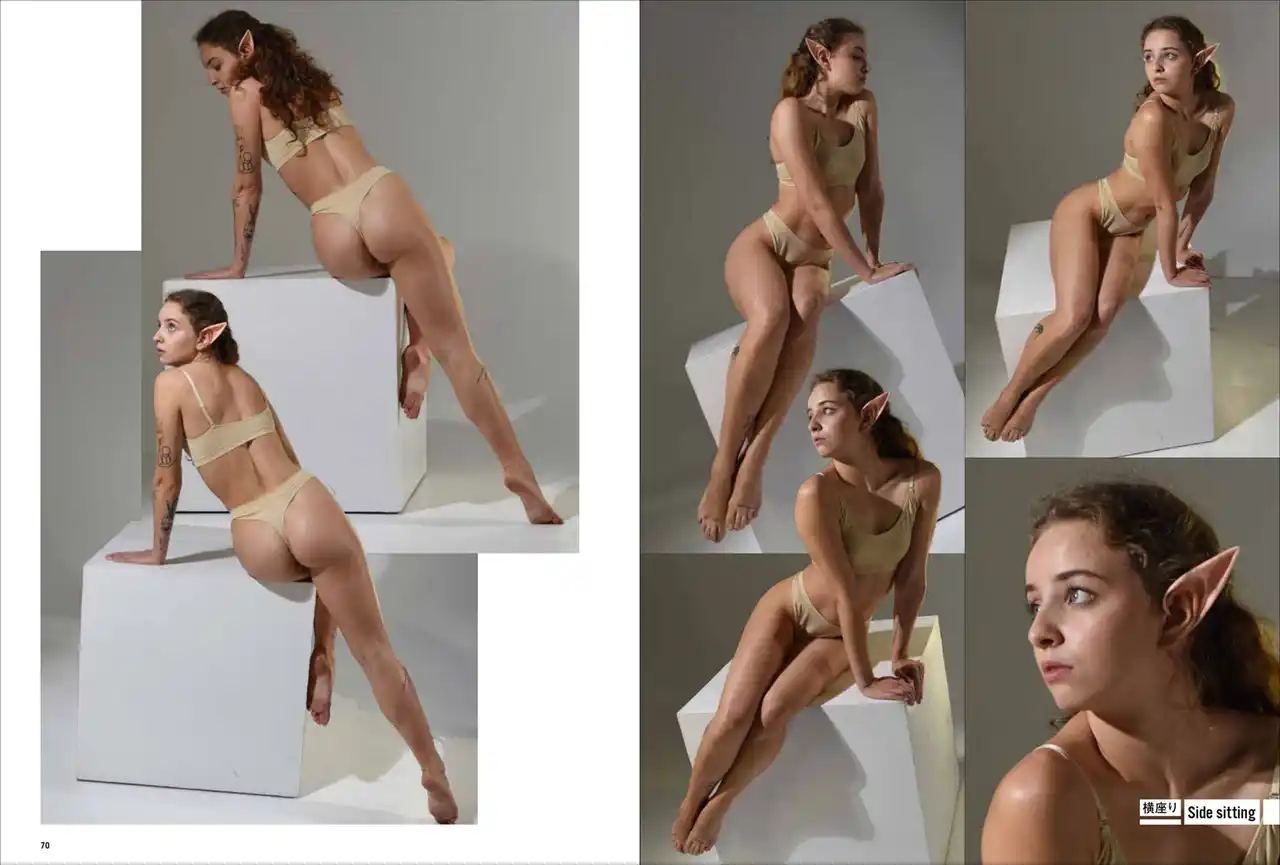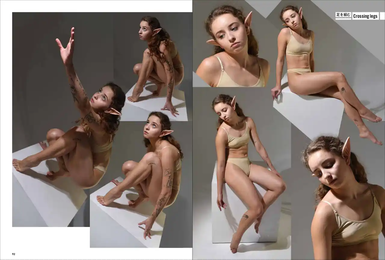 第一弾は「妖精・エルフ」。エルフの耳をつけて動き、様々なポーズをあおり、ふかん、連写など複数の画角で撮影しています。描くのが難しい「エルフ耳」の向きや位置も本書では一目瞭然。輪郭ラインのわかる水着と鍛えた筋肉で、戦うポーズから水辺でくつろぐポーズまで、バリエーション豊かなシチュエーションと動きを網羅します。 |