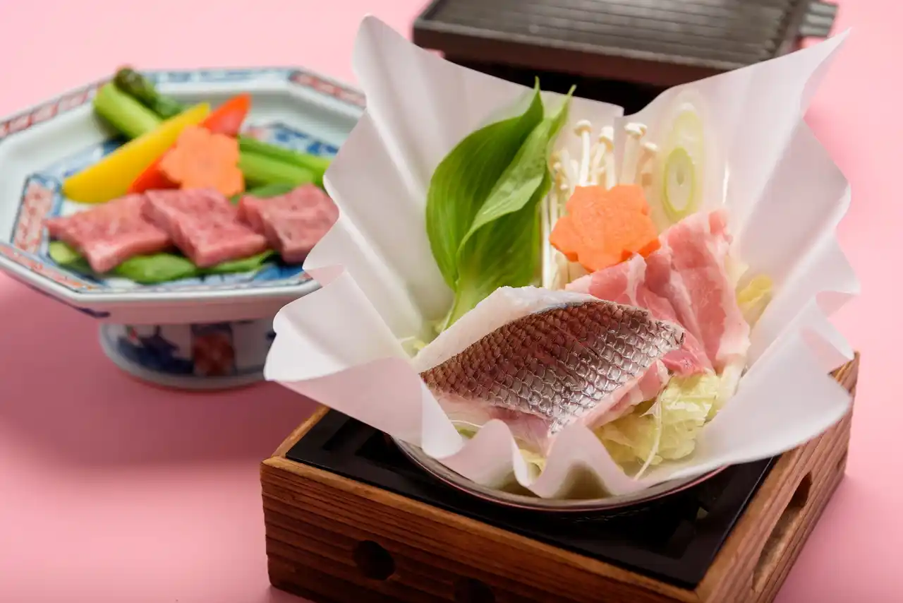 休暇村庄内羽黒「日本海の鯛と山菜・山形牛旬彩料理」 |