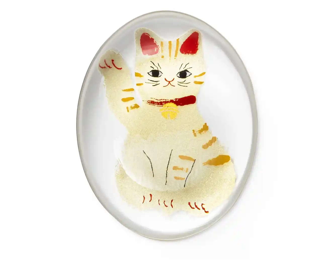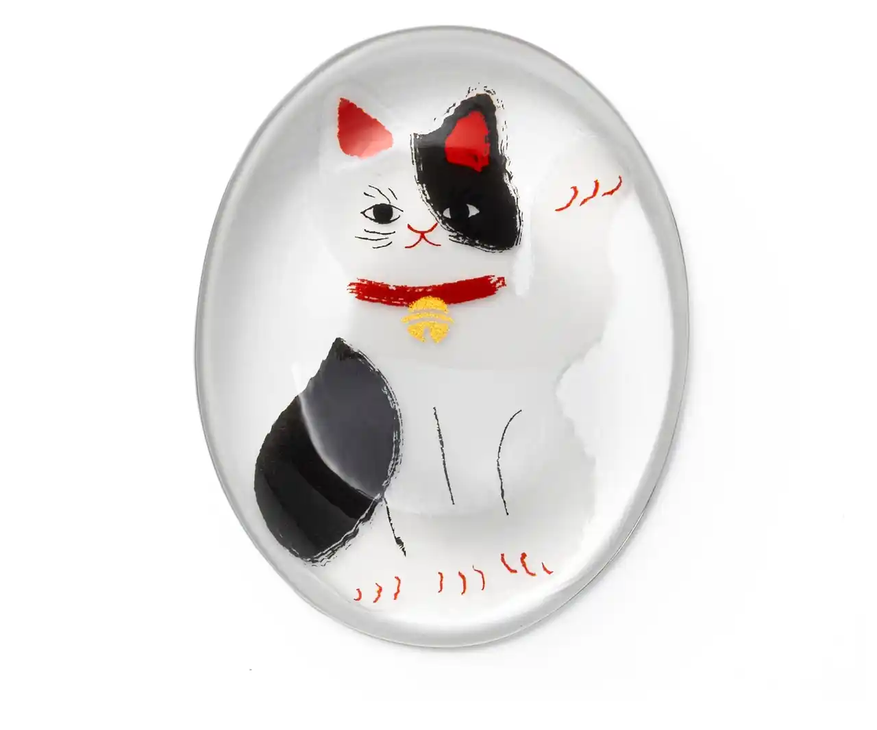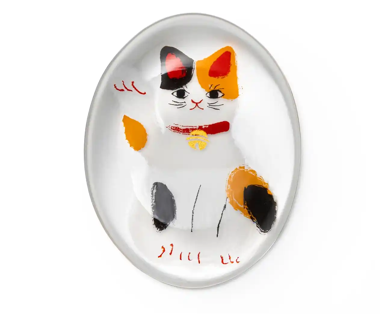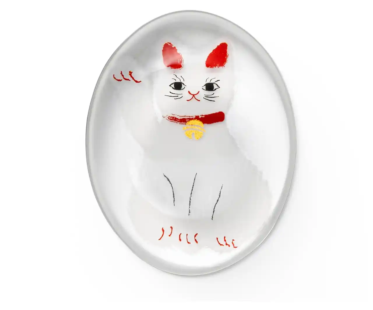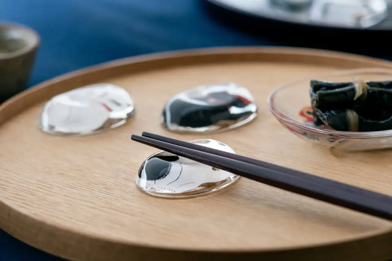 古来より、幸せを呼びこむ不思議な力があるとされる「縁起物」を、身近に楽しめるようガラス食器に写した「めでたmono」シリーズ。大切な方の幸せを願う贈り物として、また自分のラッキーアイテムとしてもお楽しみいただけます。中でも招き猫は、人や福を招く象徴として親しまれています。好評の“招き猫”柄豆皿に続く、第二弾として登場した箸置きです。やや大きめのサイズで安定感があり、日常使いでも扱いやすいのが特長。ガラスの厚みによって模様がふんわり揺らいで見え、角度によって猫の表情が異なって見えるのも魅力のひとつです。人気の猫種をモチーフにした全5柄を揃え、選ぶ楽しさも広がります。和紙風のモダンな化粧箱入りで、贈り物にも最適です。 |