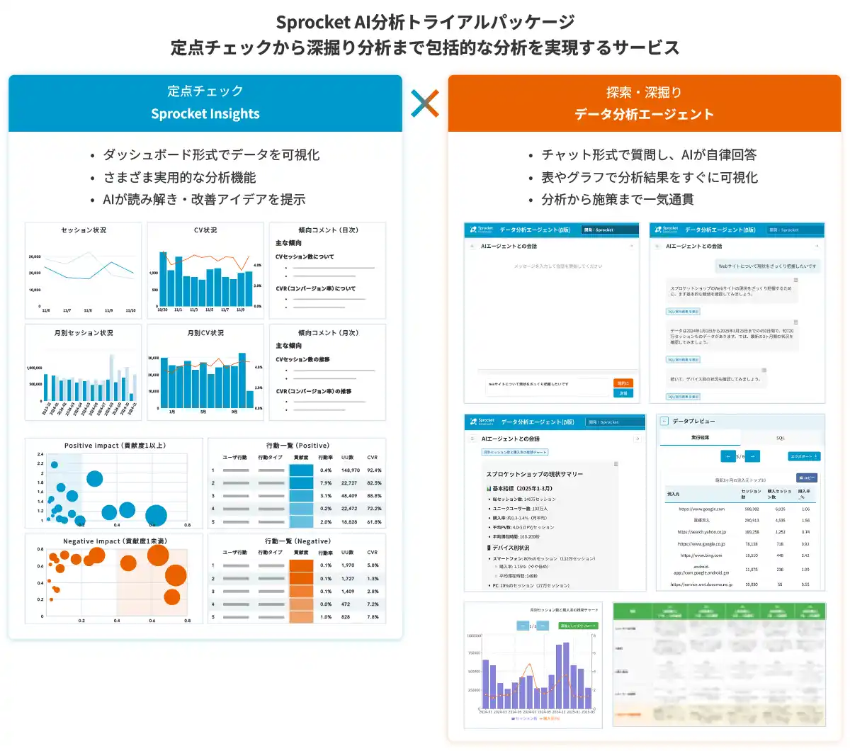 CX改善プラットフォームを提供する株式会社Sprocket(本社:東京都品川区、代表取締役:深田 浩嗣)は、Webサイトを対象としたデータ分析サービス「AI分析トライアルパッケージ」の提供を開始しました。定点チェックのダッシュボード「Sprocket Insights」とAIによる探索・深掘りできる「データ分析エージェント」を組み合わせ、分析スキルのない現場担当者でも自然言語で質問するだけで高度な分析と施策提案を実行できる環境を提供します。 |