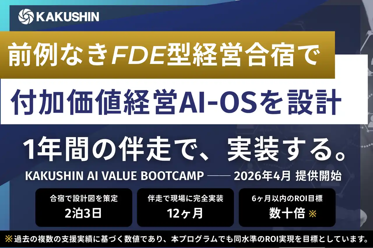 | 株式会社カクシン(東京本部:東京都港区、代表取締役CEO:田尻 望)は、エンタープライズ企業の経営層を対象とした経営変革プログラム「KAKUSHIN AI VALUE BOOTCAMP」を2026年4月より提供開始します。 | ||||||||||||||