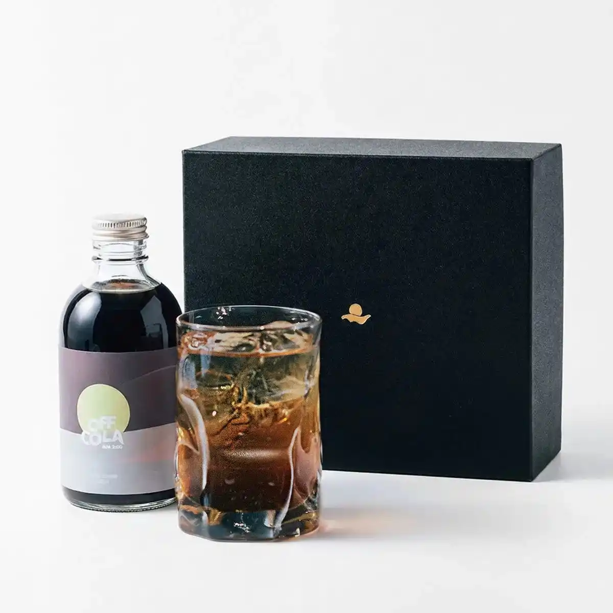 「ふっと一息つく、あなたのオフタイムに」をコンセプトに、SNSやテレビでも話題を呼んでいる〈OFF COLA〉。深夜2時をイメージしたクラフトコーラシロップ「am2:00」と、特製グラス・マドラーをシックな黒化粧箱に収めたギフトセットです。特製グラスは、透き通るようなガラスにゆらぎを持たせたフォルム。〈OFF COLA〉のオフタイムの世界観を、そのまま形にした一客です。 |