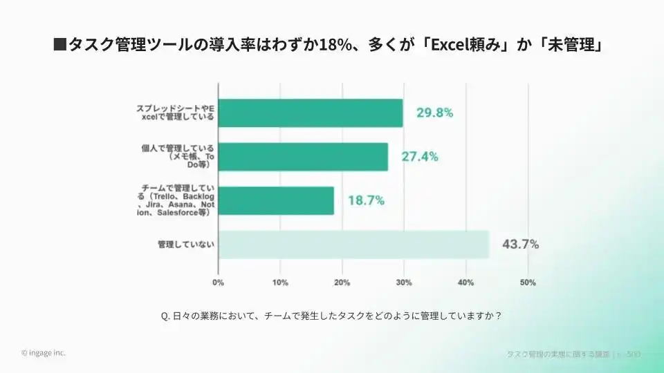 2. 低いツール導入率と「属人化」の深刻化 チームでのタスク管理において、専用ツールを導入している企業はわずか18.7%に留まっています。約3割がExcel等の汎用ソフトを使用し、4割以上は「そもそも管理できていない」という個人の記憶や裁量に頼った属人的な状態に置かれている実態が浮き彫りになりました。 |